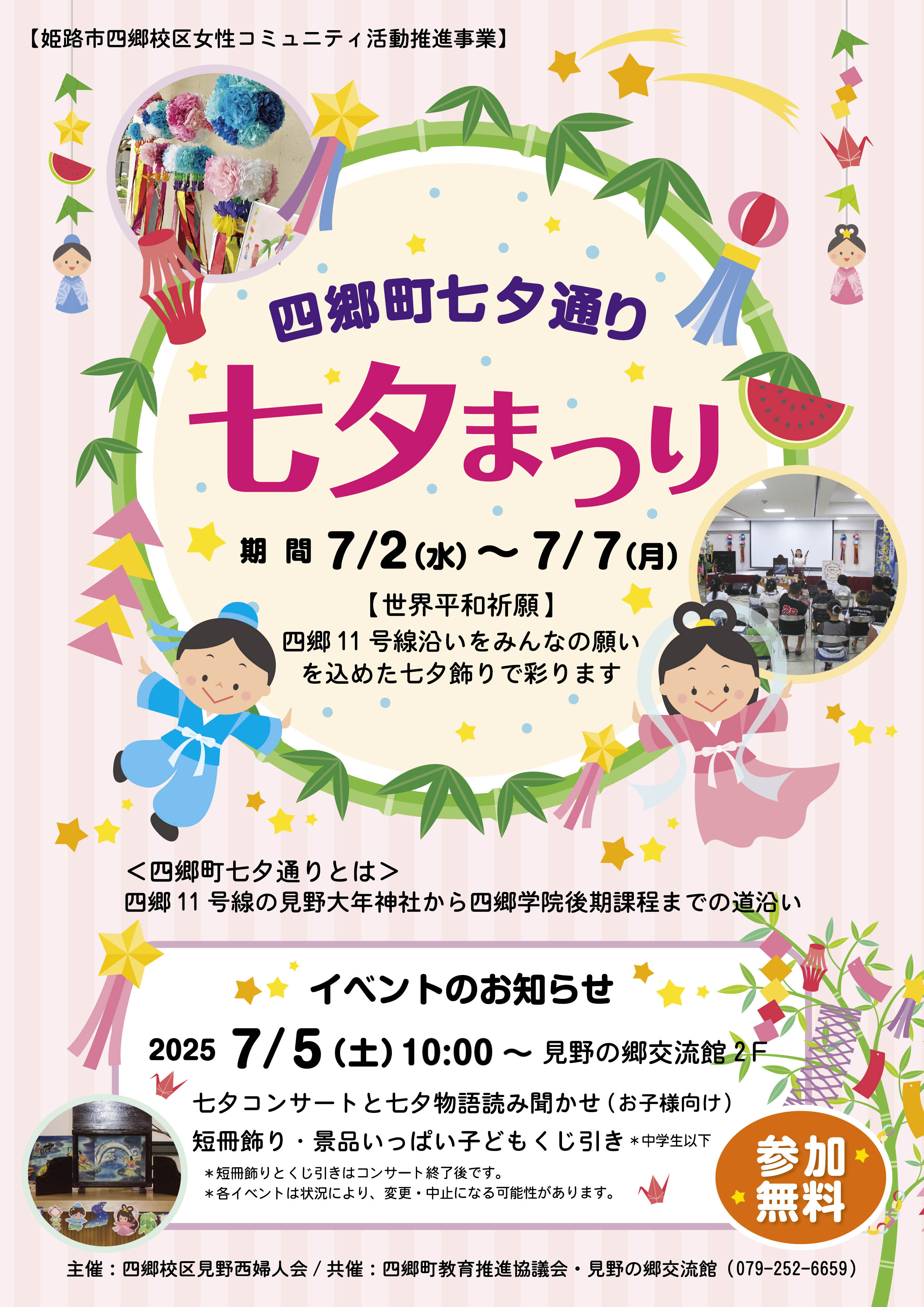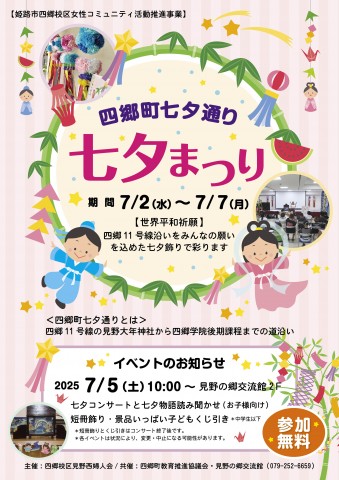 七夕まつりは日本の伝統行事ですが、最近では七夕飾りを見かけることが少なくなりました。また、家庭で七夕行事をすることもなくなったようです。そこで四郷町では、日本の伝統と文化を継承していくことが大切だと考え、令和3年から七夕飾りと七夕イベントを開催しております。日本の素晴らしさを伝え、人々のつながりを深め、地域の発展に寄与したいと思います。四郷学院後期課程から見野(西)大年神社までの道路沿いに飾られている七夕飾りを、どうかご覧下さい。七夕イベントも楽しいですよ。