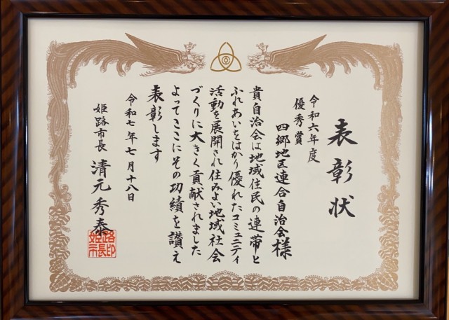 令和7年7月18日、アクリエ姫路大ホールで開催されました第74回姫路市連合自治会大会において、四郷地区連合自治会のコミュニティ活動が高く評価され、姫路市長から姫路市コミュニティ活動優秀団体として表彰状を授与されました。